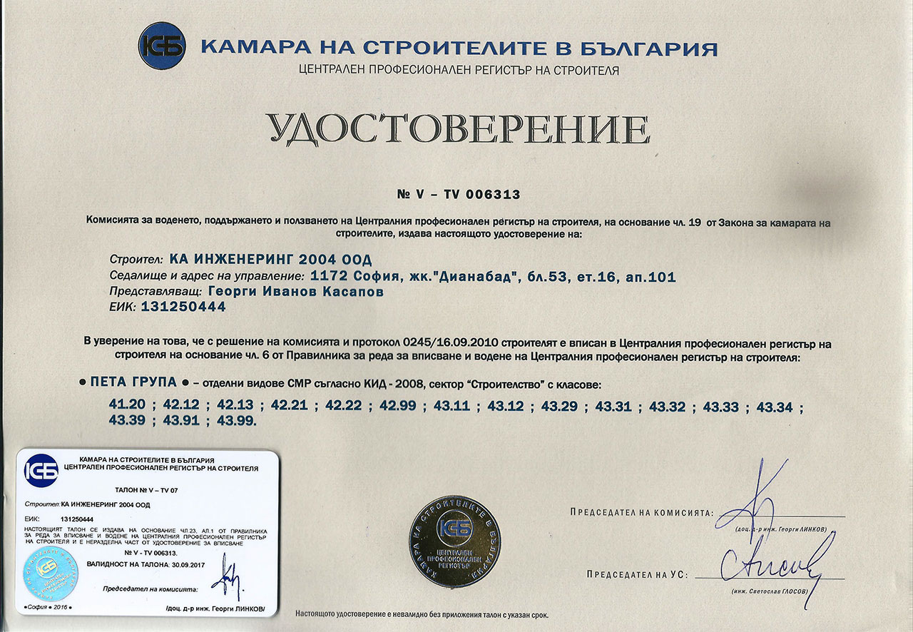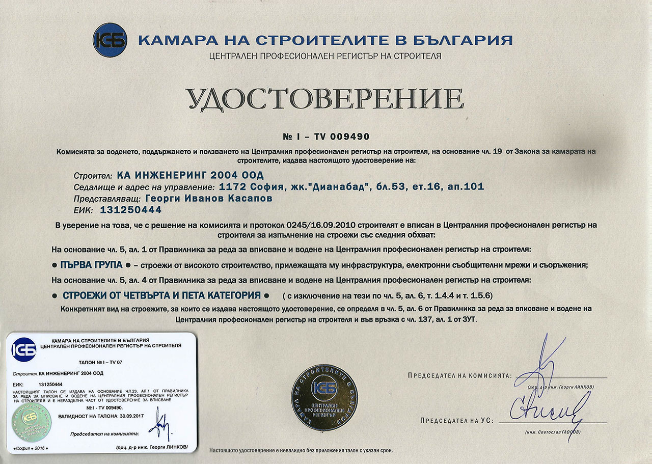 Големият опит, събиран и усъвършенстван през годините, в които "КА ИНЖЕНЕРИНГ 2004" ООД изпълни множество големи и малки обекти, спазвайки специфичните изисквания на всеки възложител доведе до изграждане на доверие в нашите клиенти и партньори.